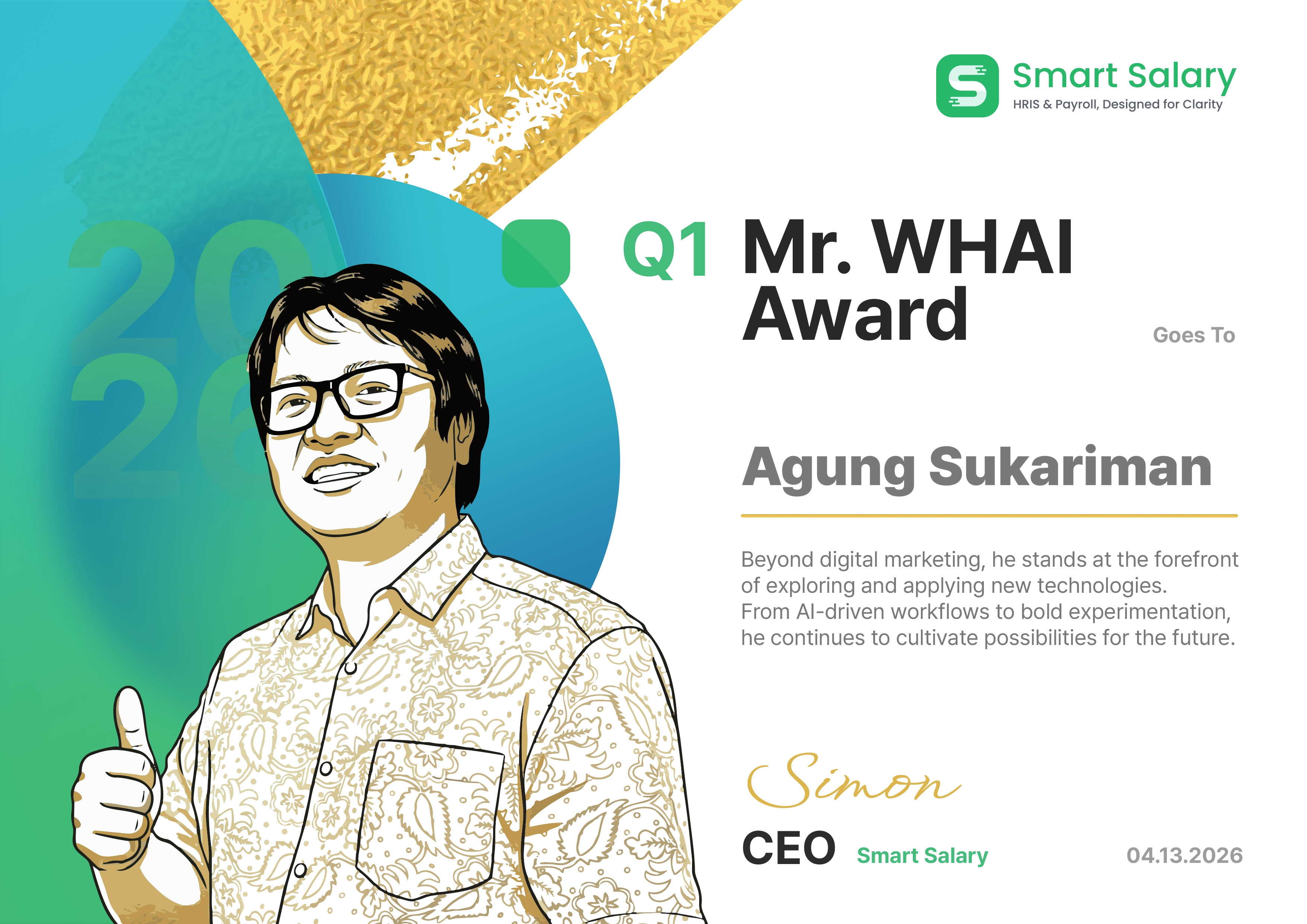 Tidak hanya itu, eksplorasi teknologi terus didorong oleh Agung Sukariman yang dianugerahi Q1 Mr. WHAI Award. Agung melangkah jauh melampaui batas pemasaran digital tradisional. Dengan mengadopsi alur kerja berbasis Artificial Intelligence (AI) dan berani bereksperimen dengan teknologi baru, ia terus memupuk berbagai kemungkinan tak terbatas untuk masa depan operasional kita.